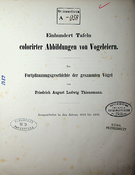 Friedrich August Ludwig Thienemann Einhundert Tafeln colorirter Abbildungen von Vogeleiern zur Fortpflanzungsgeschichte der gesammten Vögel: Ausgearbeitet in den Jahren 1845 bis 1854. – [Dresden]: [Brockhaus], 1856. – XVII; 100 Tab.
